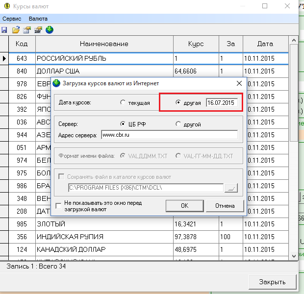 2) Теперь загружаем в классификатор курсы валют на дату подачи временного ввоза: