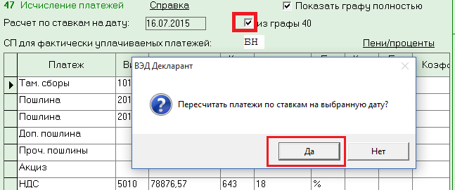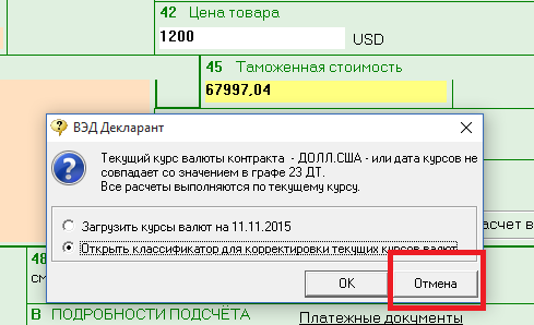 5) Рассчитываем гр. 45, отказавшись от загрузки курсов валют на текущую дату. То есть мы рассчитываем ТС, по курсу, действовавшему на дату подачи ДТ ИМ53 (Статья 64, п.2. Общие положения о таможенной стоимости).