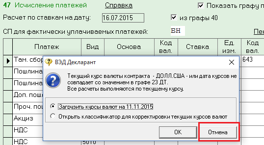 Если программа ВЭД Декларант предложит загрузить курсы на текущую дату – нажмите «Отмена»: