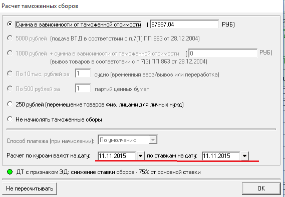 В окне «Расчет таможенных сборов» оставьте все по умолчанию, программа автоматически рассчитает сборы на дату подачи декларации ИМ40: